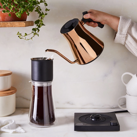 Fellow Stagg Copper je konvice navržená speciálně pro baristy a milovníky alternativní přípravy kávy. Díky perfektně tvarované hubici máte nad proudem vody maximální kontrolu, což je klíčové pro přípravu pour-over metod. Integrovaný ukazatel teploty vám umožní snadno sledovat ideální teplotu vody. Leštěná měděná povrchová úprava, tělo z nerezové oceli 304 18/8 a odolné plastové prvky zaručují dlouhou životnost a profesionální vzhled. Zatížená rukojeť poskytuje větší stabilitu a pohodlné nalévání. Kompatibilní s plynovými, elektrickými i indukčními varnými deskami.