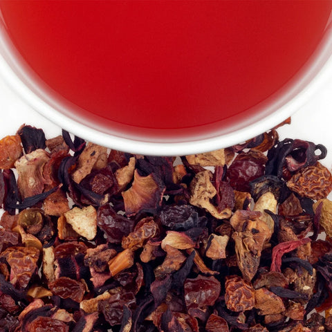 In our beautiful Strawberry Kiwi fruit tea, we blend strawberries and pieces of dried fruit with strawberry and kiwi flavors to create a bright ruby red drink. It looks festive brewed in a glass teapot and tastes great hot or iced. It is caffeine-free.