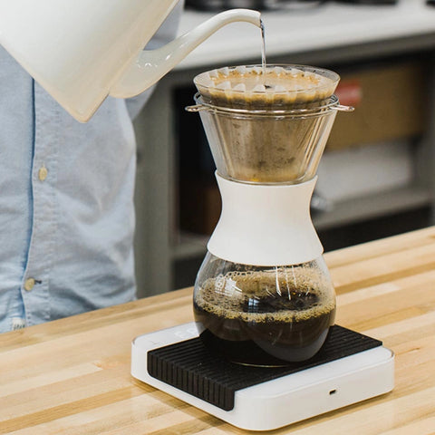 Rinse the filter with hot water, pouring directly down the middle until the water almost reaches the top of the filter, then drain. Then we recommend pouring in just enough water to moisten the coffee grounds and letting it rest for 30-45 seconds (or until the coffee flower falls off). At this point, start pouring slowly in concentric circles until the volume of water is almost to the top (pour not too close to the filter). Once the dripper is full, let it drain for 10-20 seconds. At this point, continue the filling and draining process until you reach the desired volume of water.