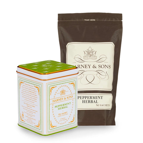 Mint tea set from Harney & Sons. The tin contains 20 pyramids and a large pack for refilling 50 pyramids.