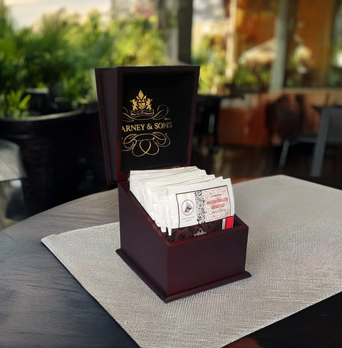 Dřevěná kazeta na čaje je výjimečný doplněk, který přináší luxusní a stylovou prezentaci individuálně balených čajových pyramid. Tato kazeta je ideální pro použití v restauracích, hotelech nebo kancelářích, kde oceníte její estetiku a praktické využití. Foto jsou pouze ilustrační, kazeta není naplněná čaji.